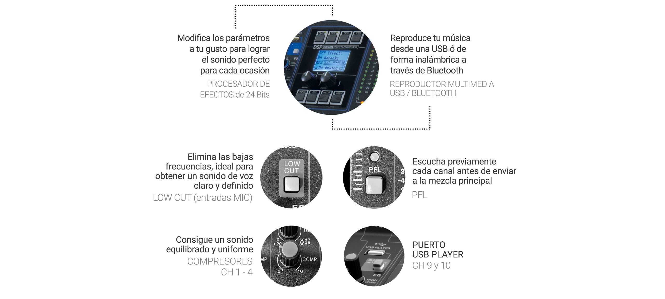 Tipos de efectos | HALL1, HALL2, ROOM1, ROOM2, STAGE,KARAOKE, SHORT DELAY, LONG DELAY, Pong DELAY, CHROUS, F LANGER, PHASER, TREMOLO, WAHWAH, MONO DELAY, REV+FLANGE, REV+CHROUS, REV+PHASER, REV+MONO ECHO, REV+SHORT DELA, REV+LONG DELAY, ECHO+FLANGE, ECHO+CHROUS, PITCH | |